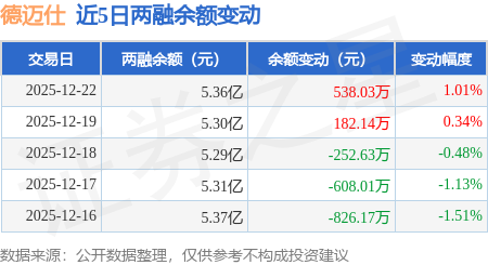 证券之星消息,12月22日,德迈仕(301007)融资买入2080.64万元,融资偿还1542.61万元,融资净买入538.03万元,融资余额5.36亿元。