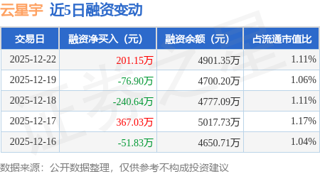 证券之星消息,12月22日,云星宇(920806)融资买入669.67万元,融资偿还468.52万元,融资净买入201.15万元,融资余额4901.35万元。