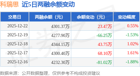 证券之星消息,12月22日,科瑞思(301314)融资买入260.74万元,融资偿还237.27万元,融资净买入23.47万元,融资余额4301.37万元,近20个交易日中有11个交易日出现融资净买入。