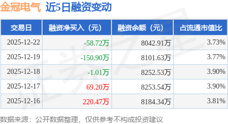 证券之星消息,12月22日,金冠电气(688517)融资买入367.47万元,融资偿还426.19万元,融资净卖出58.72万元,融资余额8042.91万元。
