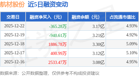 证券之星消息,12月22日,航材股份(688563)融资买入3587.1万元,融资偿还3952.38万元,融资净卖出365.28万元,融资余额3.17亿元,近20个交易日中有12个交易日出现融资净买入。