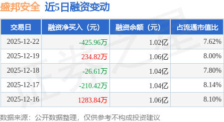 证券之星消息,12月22日,盛邦安全(688651)融资买入1006.16万元,融资偿还1432.12万元,融资净卖出425.96万元,融资余额1.02亿元。