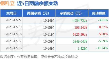 证券之星消息,12月22日,德科立(688205)融资买入2.32亿元,融资偿还2.75亿元,融资净卖出4248.75万元,融资余额10.23亿元,近20个交易日中有13个交易日出现融资净买入。