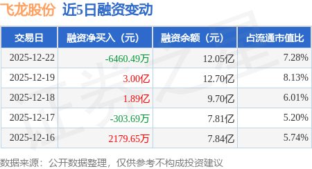 证券之星消息,12月22日,飞龙股份(002536)融资买入5.19亿元,融资偿还5.83亿元,融资净卖出6460.49万元,融资余额12.05亿元。