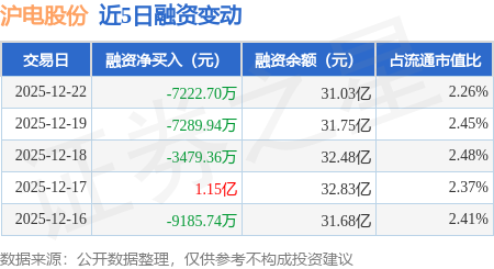 证券之星消息,12月22日,沪电股份(002463)融资买入4.8亿元,融资偿还5.52亿元,融资净卖出7222.7万元,融资余额31.03亿元。