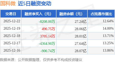 证券之星消息,12月22日,国科微(300672)融资买入1.15亿元,融资偿还1.97亿元,融资净卖出8208.0万元,融资余额27.24亿元。