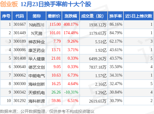 当日创业板换手率前10大个股中9只个股收涨,平均涨幅68.24%,其中N纳百川(301667)以换手率86.16%排第一,6只个股近5个交易日中多次上榜。