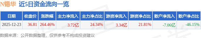 证券之星消息,截至2025年12月23日收盘,N锡华(603248)报收于36.81元,上涨264.46%,换手率80.28%,成交量55.64万手,成交额15.29亿元。