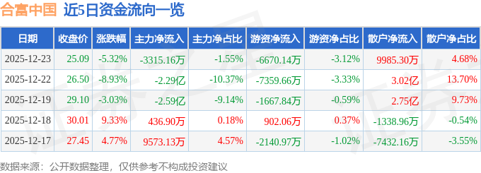 证券之星消息,截至2025年12月23日收盘,合富中国(603122)报收于25.09元,下跌5.32%,换手率20.42%,成交量81.27万手,成交额21.36亿元。