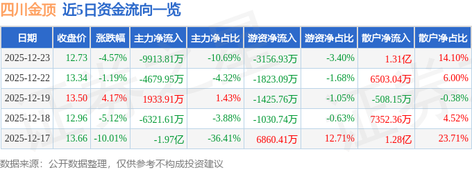 证券之星消息,截至2025年12月23日收盘,四川金顶(600678)报收于12.73元,下跌4.57%,换手率20.8%,成交量72.61万手,成交额9.27亿元。