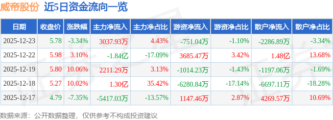 证券之星消息,截至2025年12月23日收盘,威帝股份(603023)报收于5.78元,下跌3.34%,换手率21.69%,成交量121.03万手,成交额6.86亿元。