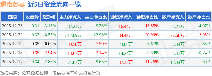 证券之星消息,截至2025年12月23日收盘,退市苏吴(600200)报收于0.31元,下跌3.12%,换手率3.9%,成交量27.72万手,成交额840.59万元。