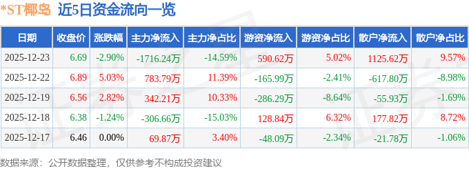 证券之星消息,截至2025年12月23日收盘,*ST椰岛(600238)报收于6.69元,下跌2.9%,换手率3.85%,成交量17.13万手,成交额1.18亿元。