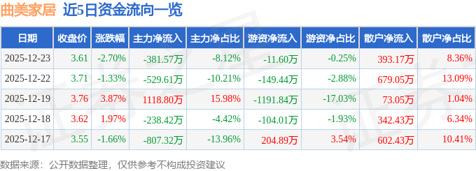 证券之星消息,截至2025年12月23日收盘,曲美家居(603818)报收于3.61元,下跌2.7%,换手率1.89%,成交量12.94万手,成交额4700.47万元。