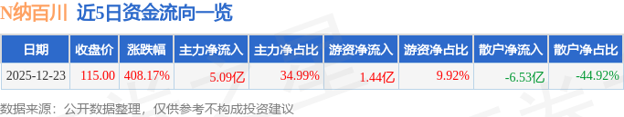 证券之星消息,截至2025年12月23日收盘,N纳百川(301667)报收于115.0元,上涨408.17%,换手率86.16%,成交量19.38万手,成交额14.54亿元。