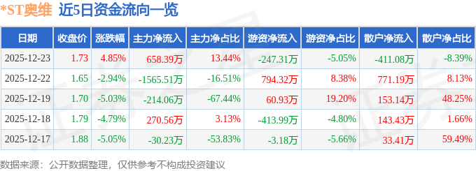 证券之星消息,截至2025年12月23日收盘,*ST奥维(002231)报收于1.73元,上涨4.85%,换手率9.41%,成交量28.96万手,成交额4898.04万元。