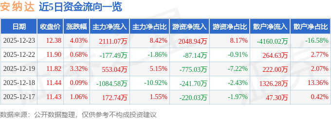 证券之星消息,截至2025年12月23日收盘,安 纳 达(002136)报收于12.38元,上涨4.03%,换手率9.58%,成交量20.55万手,成交额2.51亿元。