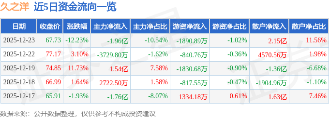 证券之星消息,截至2025年12月23日收盘,久之洋(300516)报收于67.73元,下跌12.23%,换手率14.78%,成交量26.6万手,成交额18.59亿元。