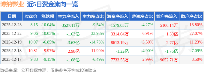 证券之星消息,截至2025年12月23日收盘,博纳影业(001330)报收于8.15元,下跌10.04%,已连续跌停2天,换手率3.3%,成交量45.39万手,成交额3.7亿元。