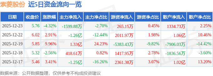 证券之星消息,截至2025年12月23日收盘,索菱股份(002766)报收于5.76元,下跌4.32%,换手率11.86%,成交量101.46万手,成交额5.92亿元。
