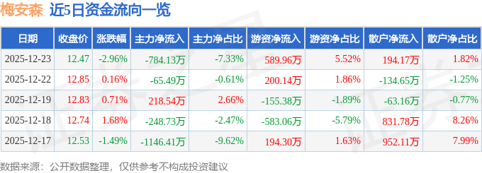 证券之星消息,截至2025年12月23日收盘,梅安森(300275)报收于12.47元,下跌2.96%,换手率3.14%,成交量8.51万手,成交额1.07亿元。
