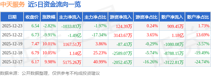 证券之星消息,截至2025年12月23日收盘,中天服务(002188)报收于6.54元,下跌2.82%,换手率31.69%,成交量81.57万手,成交额5.24亿元。