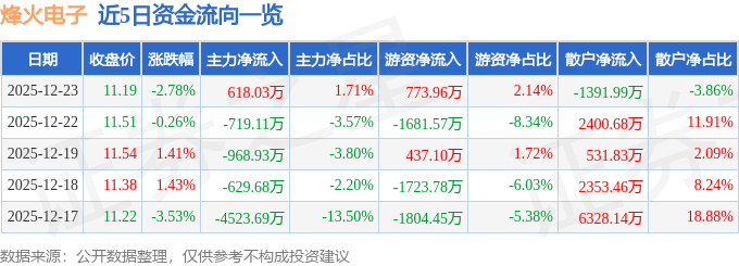 证券之星消息,截至2025年12月23日收盘,烽火电子(000561)报收于11.19元,下跌2.78%,换手率5.26%,成交量31.68万手,成交额3.61亿元。