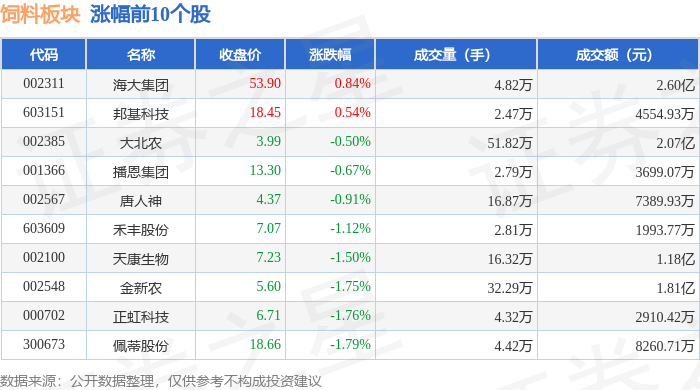 证券之星消息,12月23日饲料板块较上一交易日下跌0.75%,粤海饲料领跌。当日上证指数报收于3919.98,上涨0.07%。深证成指报收于13368.99,上涨0.27%。饲料板块个股涨跌见下表: