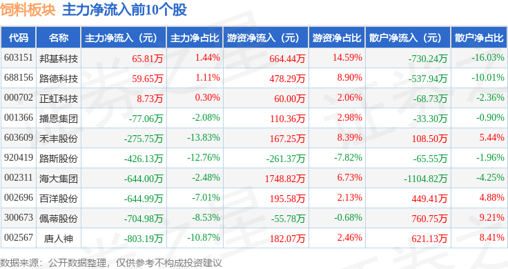 从资金流向上来看,当日饲料板块主力资金净流出1.83亿元,游资资金净流入5815.72万元,散户资金净流入1.25亿元。饲料板块个股资金流向见下表: