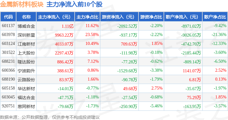 从资金流向上来看,当日金属新材料板块主力资金净流出5.4亿元,游资资金净流入8432.67万元,散户资金净流入4.55亿元。金属新材料板块个股资金流向见下表: