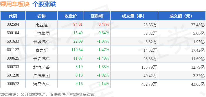 从资金流向上来看,当日乘用车板块主力资金净流出13.6亿元,游资资金净流入1.76亿元,散户资金净流入11.83亿元。乘用车板块个股资金流向见下表:
