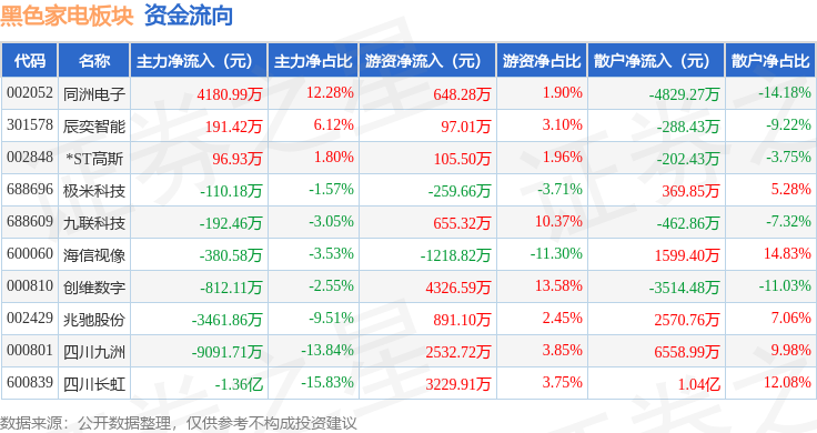 从资金流向上来看,当日黑色家电板块主力资金净流出2.32亿元,游资资金净流入1.1亿元,散户资金净流入1.22亿元。黑色家电板块个股资金流向见下表: