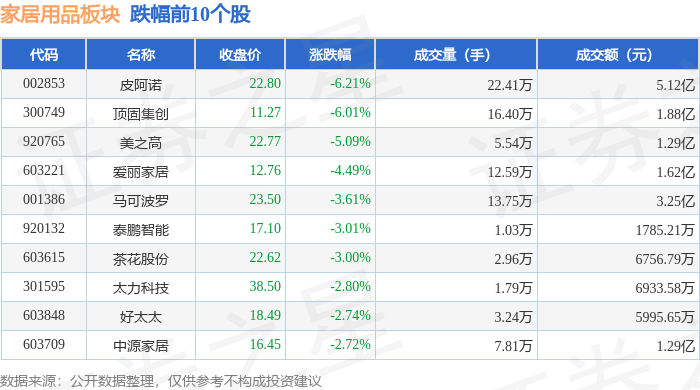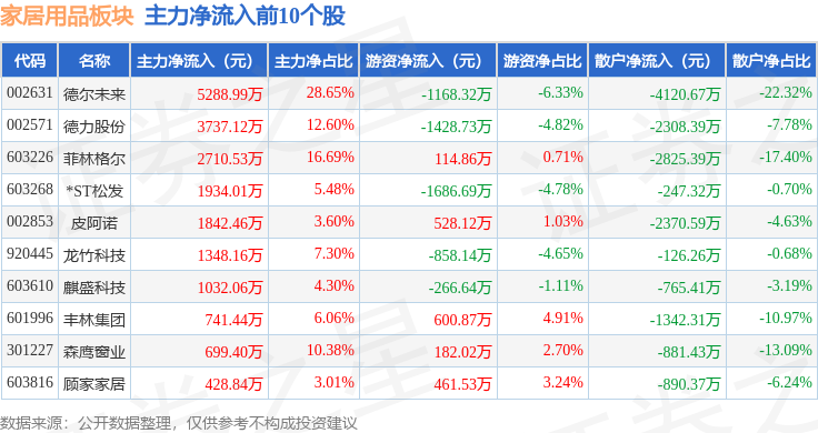 从资金流向上来看,当日家居用品板块主力资金净流出8893.71万元,游资资金净流出864.11万元,散户资金净流入9757.82万元。家居用品板块个股资金流向见下表: