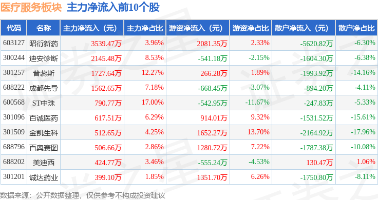 从资金流向上来看,当日医疗服务板块主力资金净流出7.47亿元,游资资金净流入1.03亿元,散户资金净流入6.44亿元。医疗服务板块个股资金流向见下表: