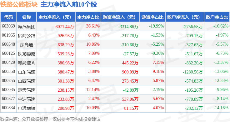 从资金流向上来看,当日铁路公路板块主力资金净流出3.2亿元,游资资金净流入2889.24万元,散户资金净流入2.91亿元。铁路公路板块个股资金流向见下表: