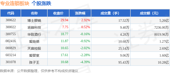 从资金流向上来看,当日专业连锁板块主力资金净流出1.2亿元,游资资金净流出610.03万元,散户资金净流入1.26亿元。专业连锁板块个股资金流向见下表: