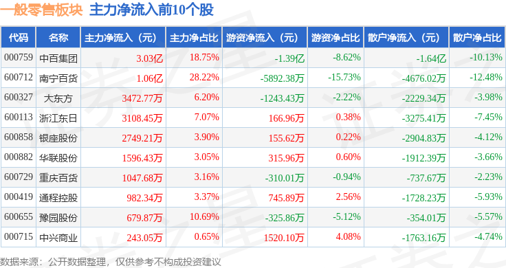 从资金流向上来看,当日一般零售板块主力资金净流出22.31亿元,游资资金净流入2.52亿元,散户资金净流入19.79亿元。一般零售板块个股资金流向见下表: