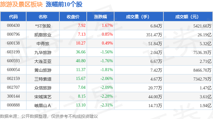 证券之星消息,12月23日旅游及景区板块较上一交易日下跌2.45%,曲江文旅领跌。当日上证指数报收于3919.98,上涨0.07%。深证成指报收于13368.99,上涨0.27%。旅游及景区板块个股涨跌见下表:
