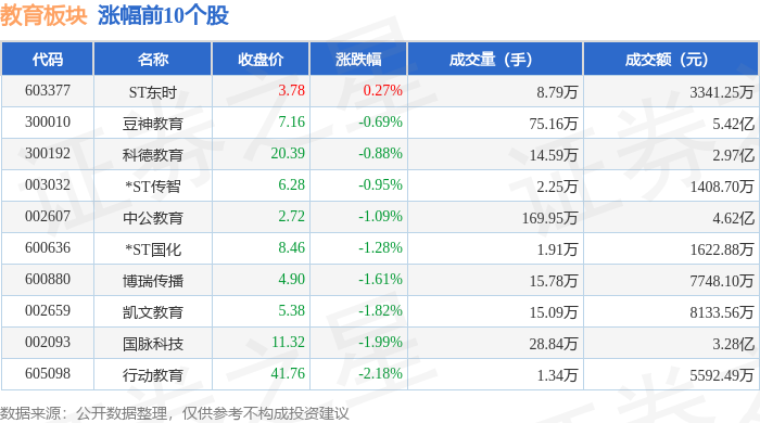 证券之星消息,12月23日教育板块较上一交易日下跌2.28%,中国高科领跌。当日上证指数报收于3919.98,上涨0.07%。深证成指报收于13368.99,上涨0.27%。教育板块个股涨跌见下表: