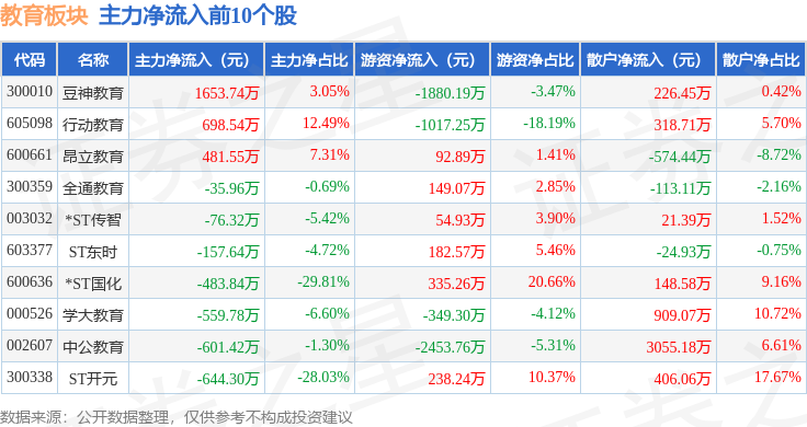 从资金流向上来看,当日教育板块主力资金净流出1.33亿元,游资资金净流出4776.49万元,散户资金净流入1.8亿元。教育板块个股资金流向见下表: