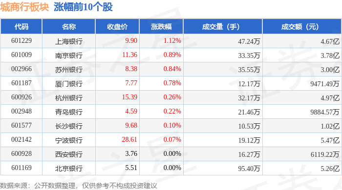 证券之星消息,12月23日城商行板块较上一交易日上涨0.26%,上海银行领涨。当日上证指数报收于3919.98,上涨0.07%。深证成指报收于13368.99,上涨0.27%。城商行板块个股涨跌见下表: