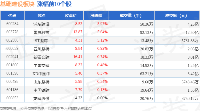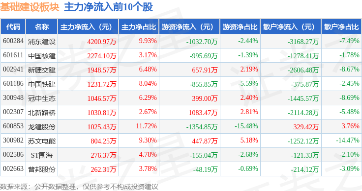 从资金流向上来看,当日基础建设板块主力资金净流出2.46亿元,游资资金净流入4499.56万元,散户资金净流入2.01亿元。基础建设板块个股资金流向见下表: