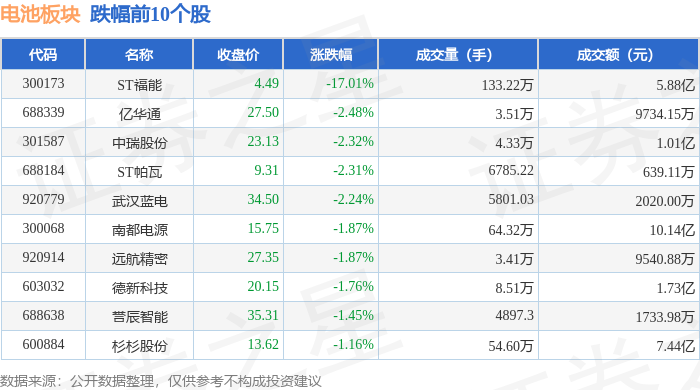 证券之星消息,12月23日电池板块较上一交易日上涨2.36%,华自科技领涨。当日上证指数报收于3919.98,上涨0.07%。深证成指报收于13368.99,上涨0.27%。电池板块个股涨跌见下表: