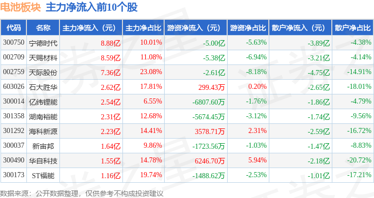 从资金流向上来看,当日电池板块主力资金净流入52.96亿元,游资资金净流出16.04亿元,散户资金净流出36.92亿元。电池板块个股资金流向见下表: