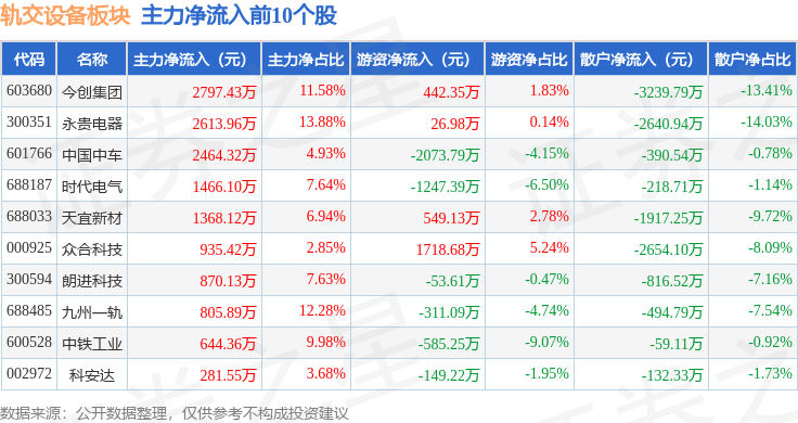 从资金流向上来看,当日轨交设备板块主力资金净流入8656.77万元,游资资金净流入1793.06万元,散户资金净流出1.04亿元。轨交设备板块个股资金流向见下表: