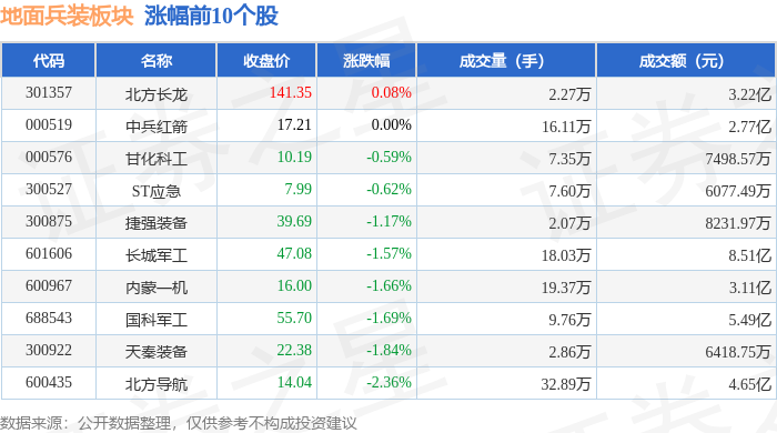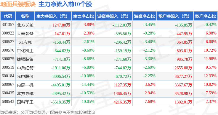 从资金流向上来看,当日地面兵装板块主力资金净流出3.61亿元,游资资金净流出2028.27万元,散户资金净流入3.81亿元。地面兵装板块个股资金流向见下表: