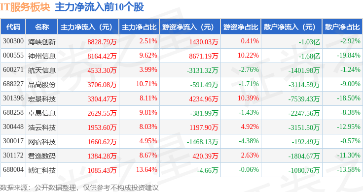 从资金流向上来看,当日IT服务板块主力资金净流出20.08亿元,游资资金净流入6.43亿元,散户资金净流入13.65亿元。IT服务板块个股资金流向见下表: