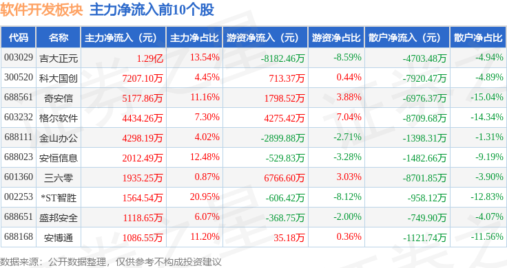 从资金流向上来看,当日软件开发板块主力资金净流出18.73亿元,游资资金净流入6.63亿元,散户资金净流入12.11亿元。软件开发板块个股资金流向见下表:
