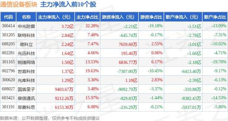 从资金流向上来看,当日通信设备板块主力资金净流出52.01亿元,游资资金净流入23.09亿元,散户资金净流入28.92亿元。通信设备板块个股资金流向见下表: