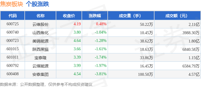 证券之星消息,12月23日焦炭板块较上一交易日下跌1.44%,安泰集团领跌。当日上证指数报收于3919.98,上涨0.07%。深证成指报收于13368.99,上涨0.27%。焦炭板块个股涨跌见下表: